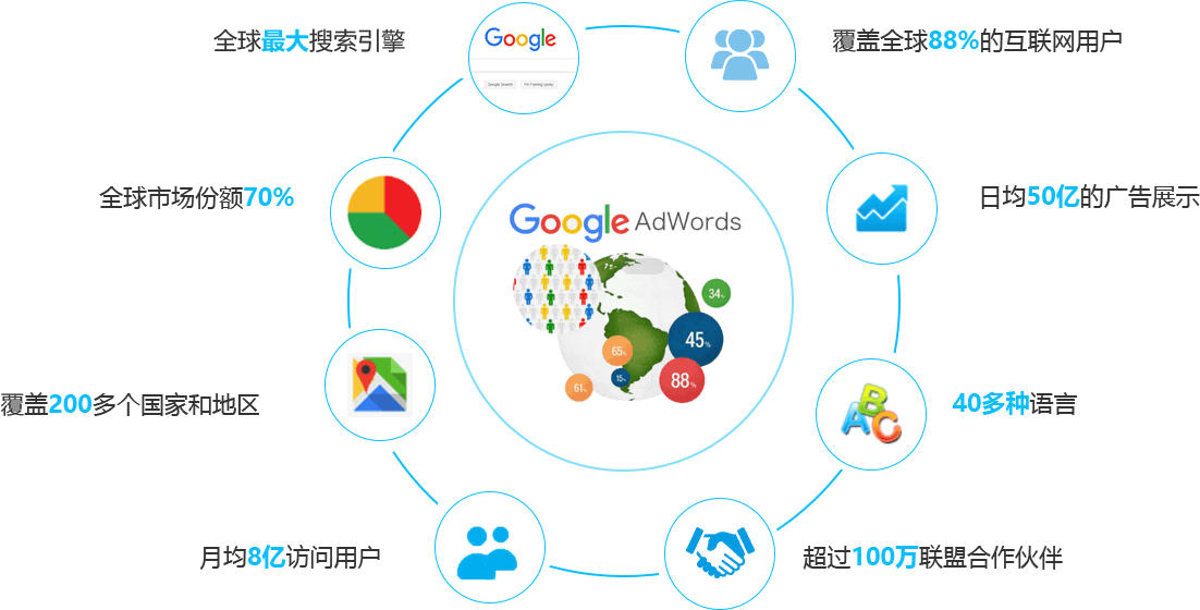Google是全球最大的搜索引擎,用户覆盖全球70%以上的国家,轻松将产品推广到全球